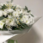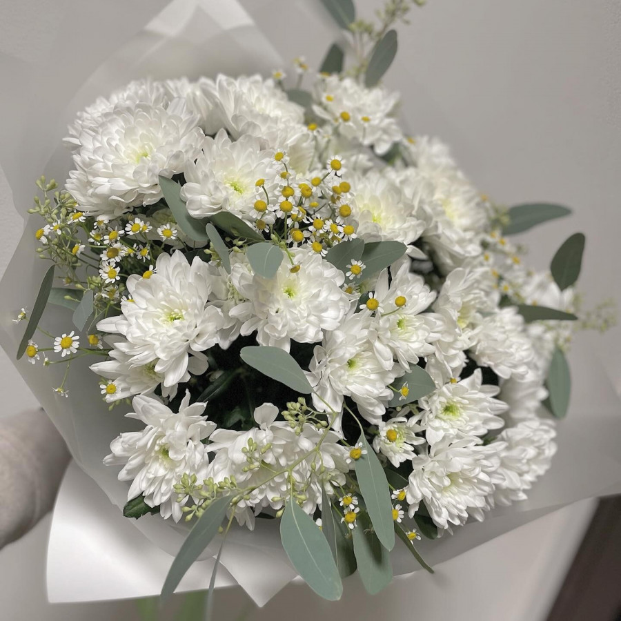 На фото букет из хризантема и танацетума. В составе: хризантема кустовая 7 шт, танацетум 2 шт, крафт-бумага 1 шт, . Все цветы свежие и ароматные, букет красиво оформлен и отлично подходит для подарка. Доступна доставка цветов или самовывоз.