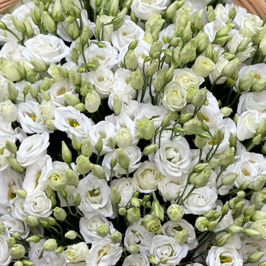 На фото корзина из 101 белой эустомы. В составе: эустома (лизиантус) 101 шт, корзина (xl) 1 шт, . Все цветы свежие и ароматные, букет красиво оформлен и отлично подходит для подарка. Доступна доставка цветов или самовывоз.